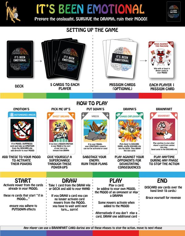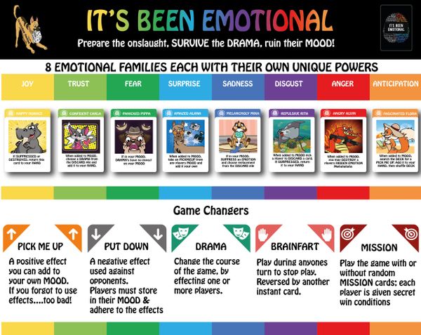 “It's Been Emotional" a new strategic table top card game filled with fun for friends and family; unleash powerful emotions against your opponents, ride the emotional roller coaster, fend off attacks, survive the onslaught.....
