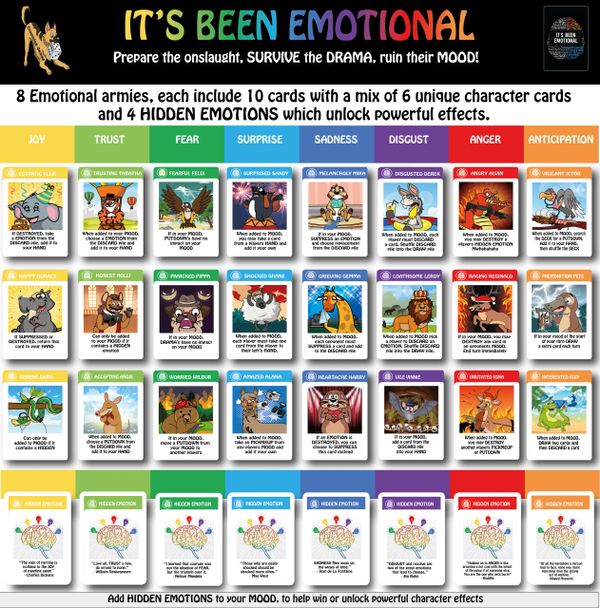 EMOTIONS: There are 80 character cards, 10 cards per 8x emotional families or army; each colour with their own unique power traits. These include both Unique Characters or Hidden Emotions which are required to unlock powerful effects